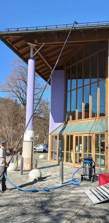 Dachrinnen bis zu einer Höhe von 12 m reinigen wir ohne den Einsatz von Leitern oder Hebebühnen, mit unserem Sky Vac Elite Dachrinnensauger, vollständig vom Boden aus. Dieses Verfahren spart Zeit und Kosten und erhöht die Arbeitssicherheit erheblich.